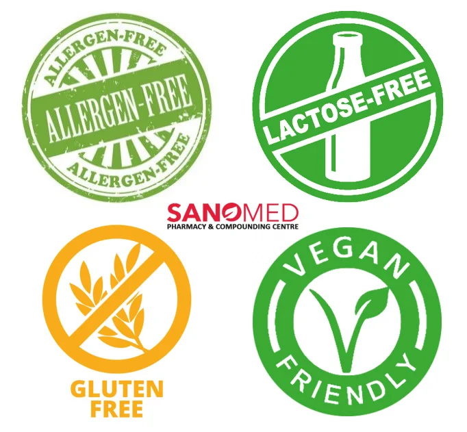 To request a customised medication free of allergens, gluten, lactose, or animal-derived ingredients, simply mention your needs to our pharmacist when placing an order. We help you find the right medication to meet your unique needs and preferences. Contact us today to learn more about our compounding services and how we can assist you.